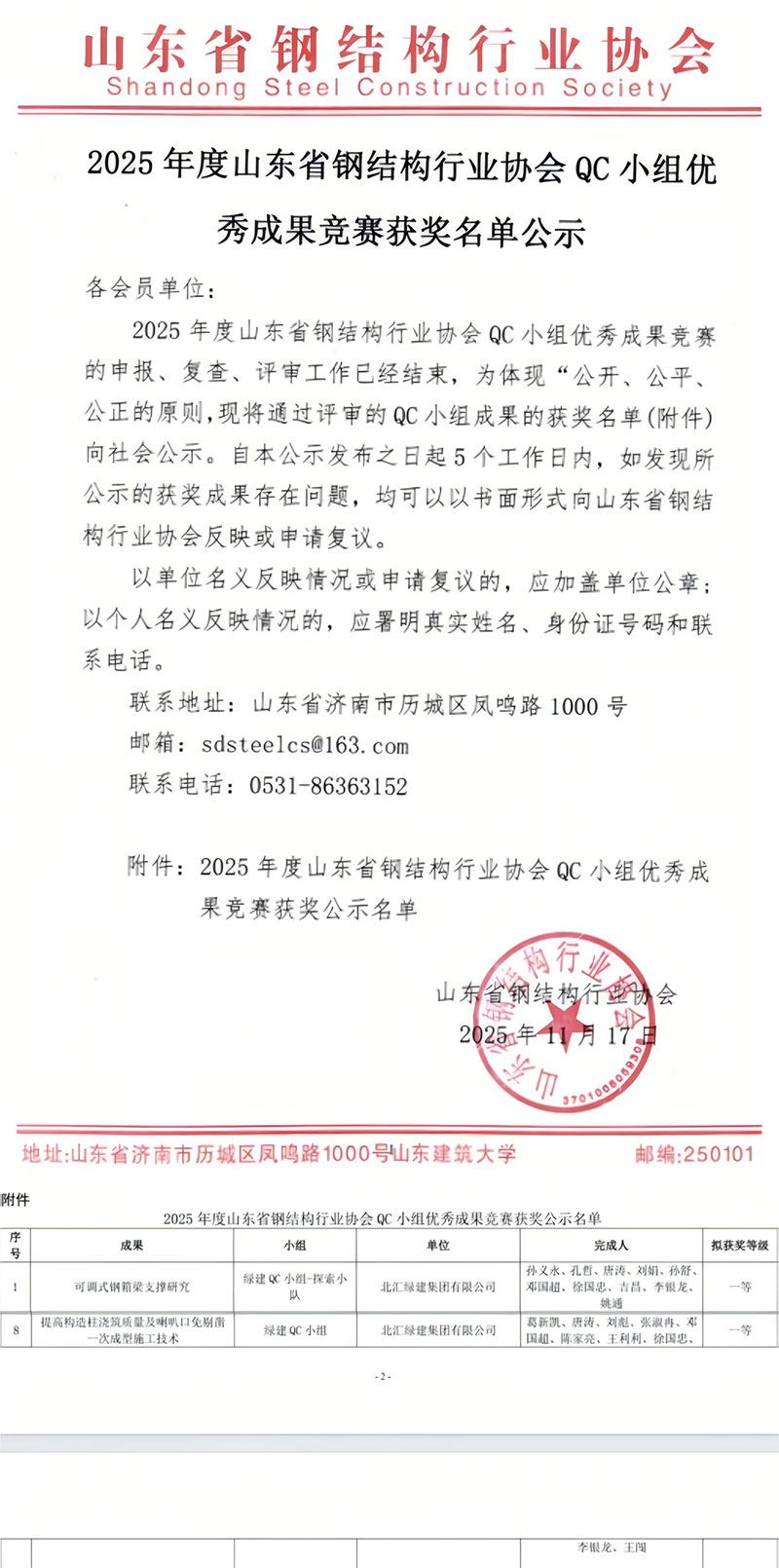 在山东省钢协QC竞赛中,两项一等奖的荣誉尽显团队协作的力量。针对“可调式钢箱梁支撑研究”的施工难题,技术负责人牵头统筹,施工人员反馈一线痛点,技术骨干优化方案,材料员精准对接配件,众人反复研讨试验,最终形成实用创新的解决方案;“提高构造柱浇筑质量及喇叭口免剔凿一次成型施工技术”的攻关中,团队跨岗位协作,从模板设计到浇筑工艺全程共研共管,用集体智慧破解传统工艺难题,兼顾质量与效率。