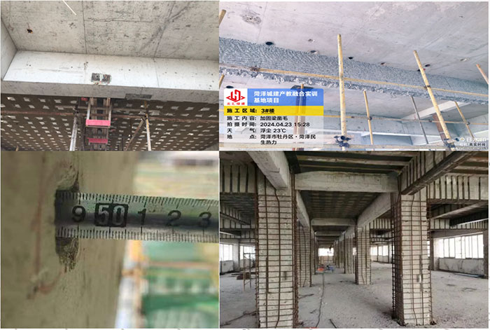 本工程的加固方式分为梁截面加大、粘贴碳纤维布、粘钢、包钢等形式。施工内容包括凿毛、植筋、钢筋绑扎、模板安装、浇筑灌浆料、浇筑混凝土、粘贴碳纤维布、柱子包钢等,最深植筋深度约50cm。