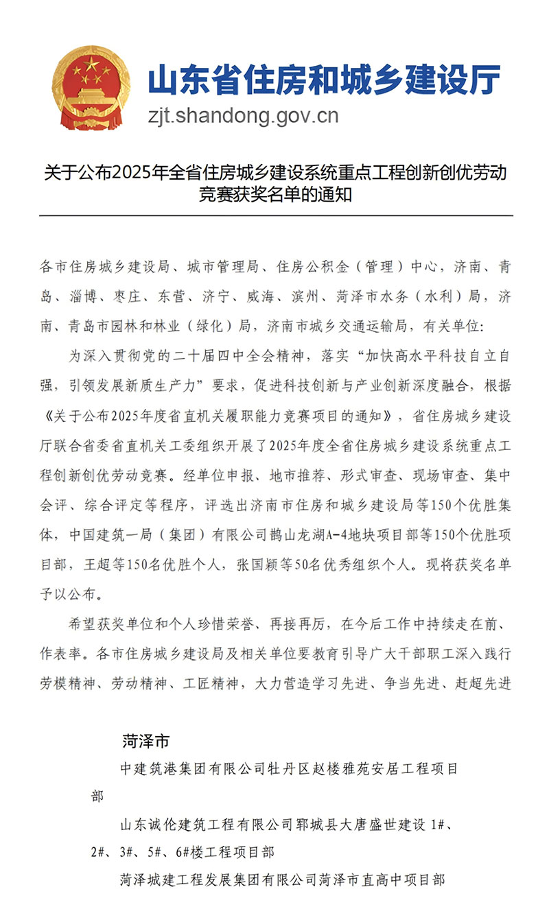 在全省住房城乡建设系统创新创优劳动竞赛中,项目凭借规范管理、扎实质量与创新获评“优胜项目部”,这既是对团队协同作战能力的肯定,更鞭策着大家持续精进。